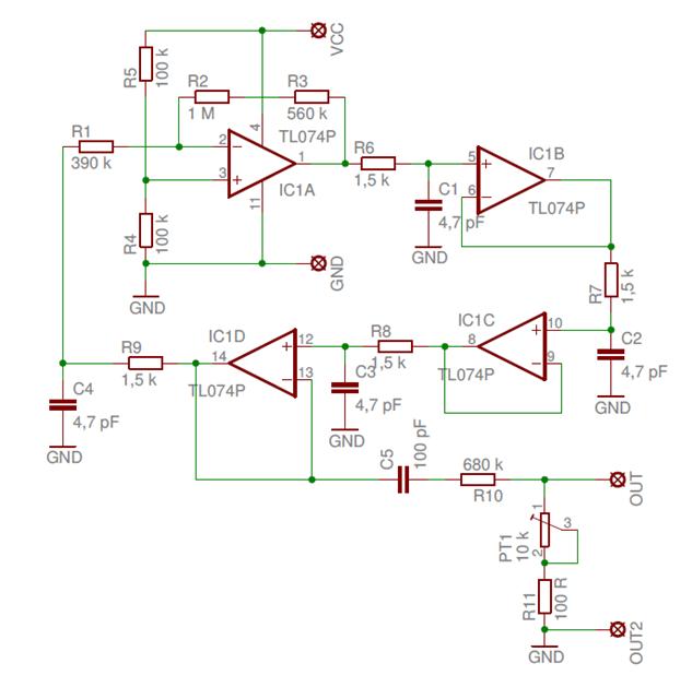 gain controlled by PT1. Finally, the emitter follower output stage provides a